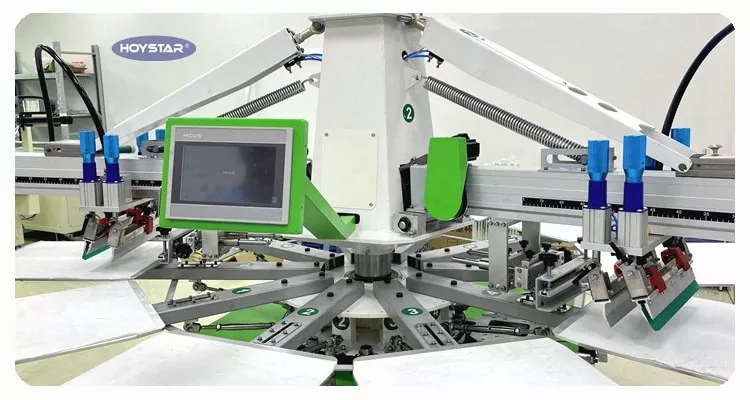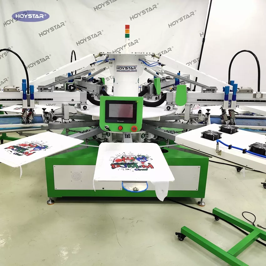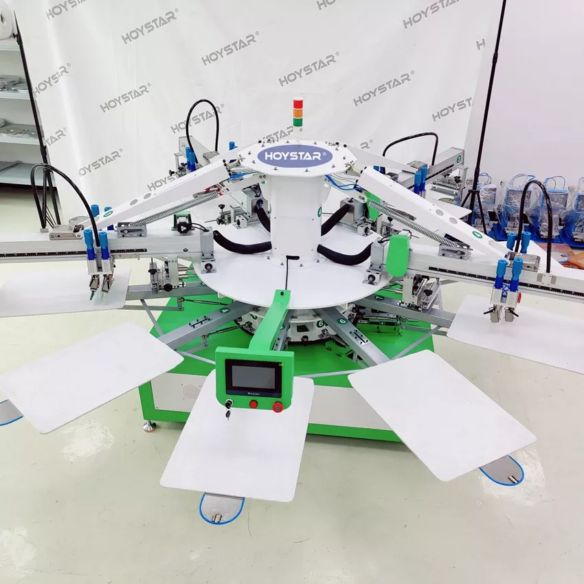 Denna HOYSTAR 4 färg T-shirt textiltryck screentryckmaskin är designad speciellt för tryckeribranschen. Utrustad med en intelligent mikroprocessor, pekskärm och motordrivet system, säkerställer den hög utskriftsstabilitet och färgregistreringstolerans inom ±0,1 mm, vilket avsevärt förbättrar utskriftsnoggrannheten och konsekvensen. Lämplig för olika utskriftsapplikationer som T-shirt, kläder, etiketter och tyg. Denna automatiska screenskrivare är din idealiska lösning för högprecision och effektiv tryckproduktion.