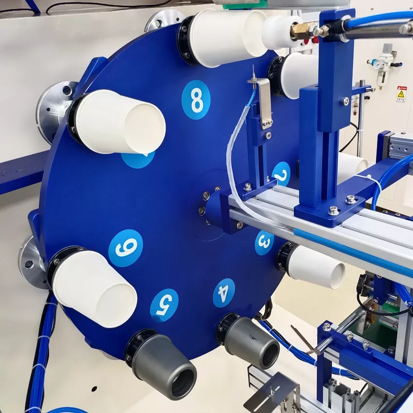 9. Multistationspositionering uppnås via roterande indexeringssystem med hög precision (tillverkat i Taiwan), vilket säkerställer stabilitet, hastighet och förbättrad effektivitet.