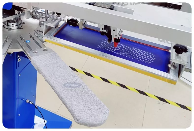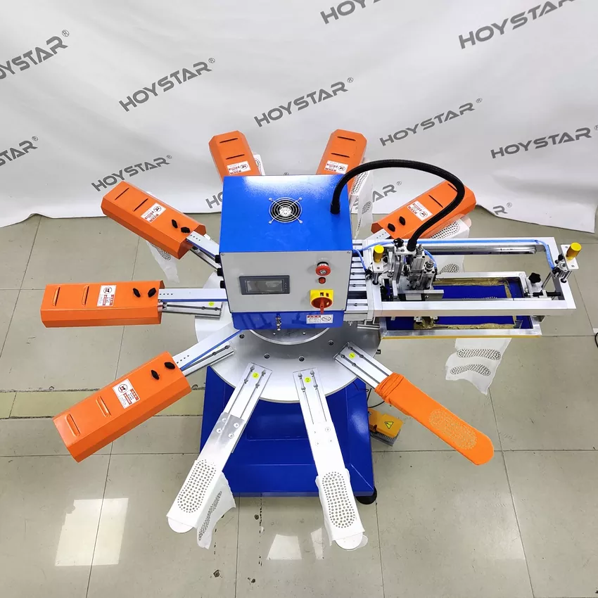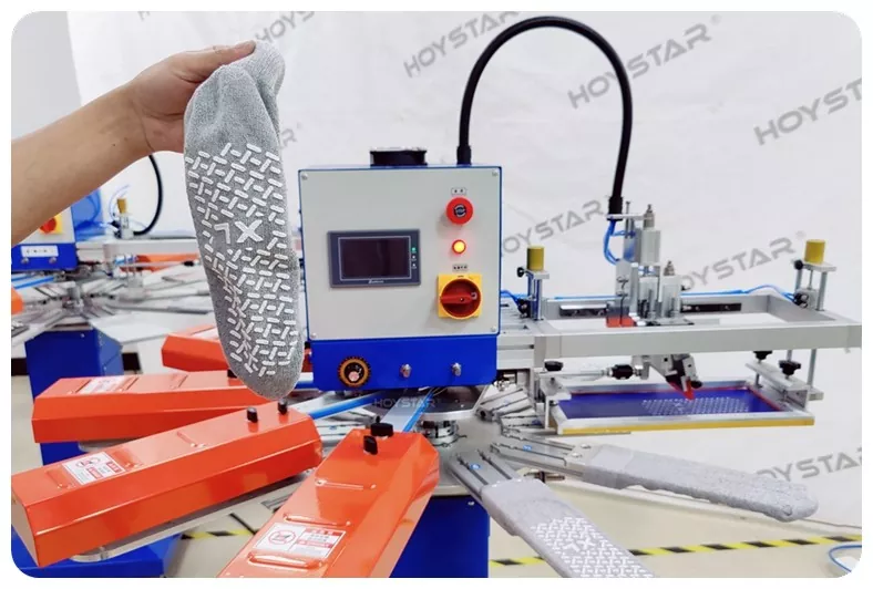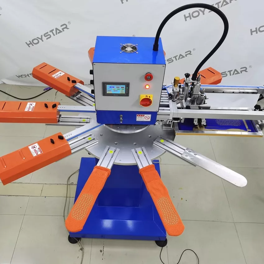 Som professionell tillverkare och leverantör är HOYSTAR High Rapid Screen Printing Machine for Socks designad för applikationer inom textilstickningsindustrin. Med en hastighet på upp till 1000PCS/Hr är den lämplig för utskrift av halkfria strumpor, babystrumpor, vuxenstrumpor, fotbollsstrumpor, etc. Utrustad med roterande arbetsbord är det mycket bekvämt att ladda och ta av strumpor. PLC-pekskärmskontroll, mycket lätt att använda. Maskin utrustad med torksystem kan torka kisel och bläck väl.