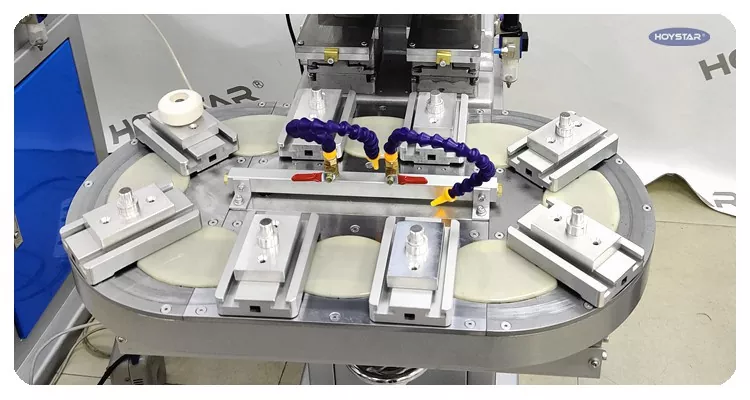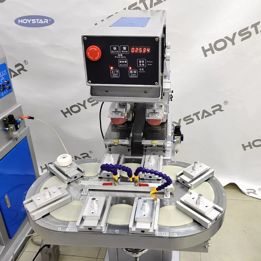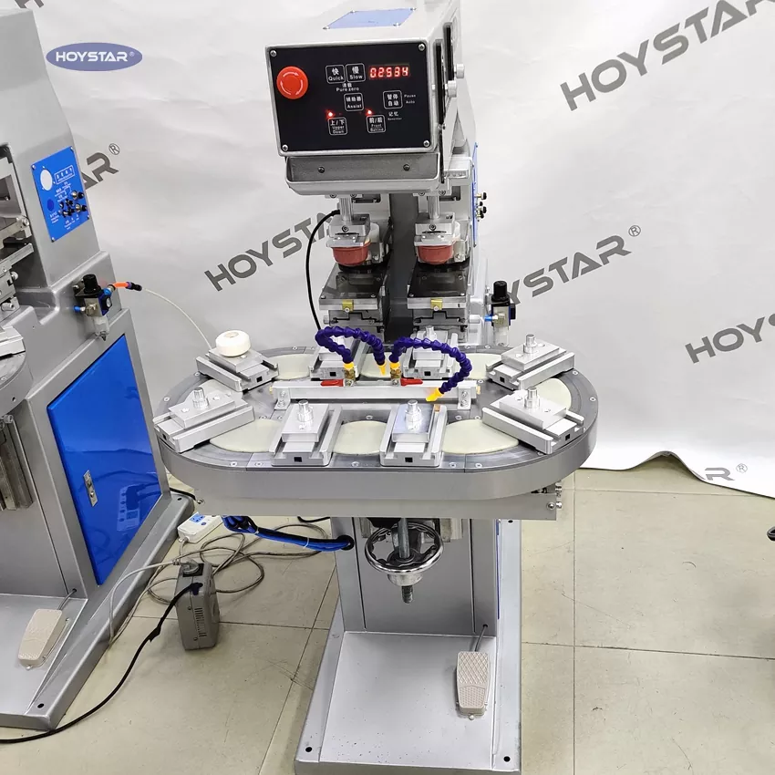 HOYSTAR är en pålitlig tillverkare och leverantör i Kina; HOYSTAR Two Color Rotary Table Pad Printing Machine är en högkapacitets- och kostnadseffektiv utskriftsutrustning. Maskinen erbjuder bekväm justering, stabil drift och bra utskriftseffekt. Maskinen levererar jämn utskriftskvalitet och lämpar sig för utskrift av ett brett utbud av föremål såsom elektroniska produkter, plastskal, hårdvaruprodukter, pappersvaror, småkonst och hantverk, samt de små logotyperna på ytan av presenter med mera. Kan möta olika behov av tvåfärgstryck från kunder.